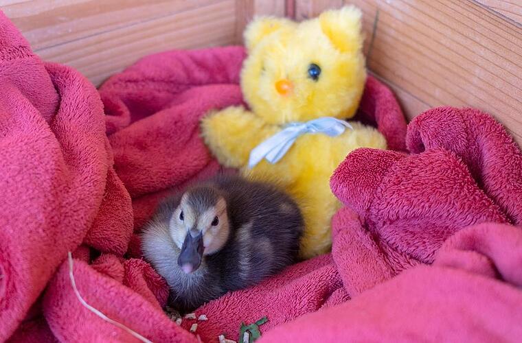 Für Claudia Saalmüller war sofort klar: Hier wird Hilfe gebraucht. Dass sie die Entchen adoptieren würde, war keine Frage. Die Neuankömmlinge wurden sofort versorgt: Im Garten mussten sich die Bewohner im Meerschweinchenkäfig erst einmal mit der Hälfte des Platzes zufrieden geben – der andere Teil gehörte jetzt zu Entenhausen. Die Versorgungsfrage war auch schnell geklärt: Nach dem Anruf bei einem Entenzüchter ließen die Leckereien nicht lange auf sich warten. Zu Löwenzahn und Brennnesseln kam ein spezielles Trockenfutter, das groß und stark macht.