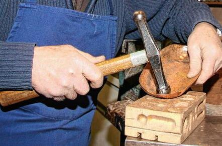 „In meiner Lehre war ich ein Vierteljahr beim Huppmann in der Kupferschmiede gewesen“, erinnert sich der rüstige Rentner noch gut an seine ersten Jahre als „Stift“. Das Kupferdengeln ist eine sehr filigrane Arbeit, bei dem für manches Objekt locker 1000 Hammerschläge draufgehen. Was mit einem Stück Kupferblech beginnt, treibt der Kunsthandwerker in die Breite und die Tiefe und verwendet auch Holzformen, um Ausbauchungen zu erreichen.
