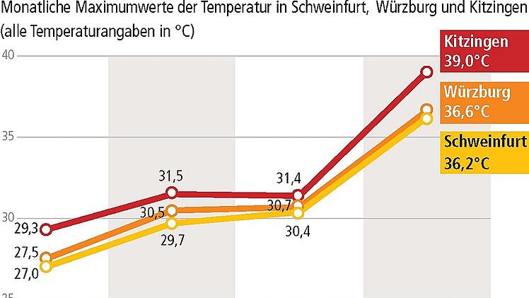 So lag die Durchschnittstemperatur in Würzburg im Juli bei 22,2 Grad. In Kitzingen und Schweinfurt fiel der Wert etwas niedriger aus. Nach bisherigem Stand behält Kitzingen den Hitzerekord. Vergangenen Sommer registrierte der DWD an der dortigen Messstation 40,3 Grad Celsius. Diesen Juli wurden dort 39 Grad gemessen.
