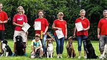 Die Ausbilder Martina und Vanessa Weltner sowie Sebastian Schoppa vermittelten ein abwechslungsreiches, intensives Trainingsprogramm, das mit Spaß und Motivation zum Erfolg führte. Unter den Augen von Leistungsrichter Dieter Teichmann vom Bayerischen Landesverband für Hundesport zeigten Hund und Halter, dass sie ihre Lektion gut gelernt hatten. Zunächst mussten die Hundeführer den sogenannten Sachkundenachweis bestehen. Hierbei geht es um Fragen rund um den Hund wie zum Beispiel richtige Haltung, Ernährung, Krankheiten des Hundes, aber auch rechtliche Situationen bezüglich Jagdrecht oder Tierschutzgesetz. Erst wenn dieser Theorieteil erfolgreich absolviert ist, geht es in die praktische Prüfung. Zu Beginn steht die Unbefangenheitsprüfung des Hundes, das heißt, dem Leistungsrichter werden alle Hunde einzeln vorgeführt. An lose gehaltener Leine überprüft der Richter die Identität des Hundes mittels eines Chipkartenlesegerätes.