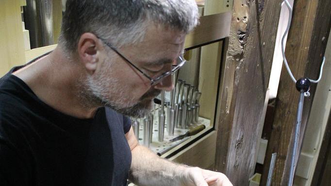Albert Naß wartet oben. Ziemlich eng geht es dort zu. Der Orgelbauer zeigt einen Platz, auf dem man sich vorsichtig ein bisschen bewegen und fotografieren kann. Ist man auch nur ein kleinwenig unvorsichtig, fallen die ersten, kleinen Holzteile am Boden um. Ein provisorisches Holztischlein mit vielleicht 20 Zentimetern Breite hat Naß oben zwischen den Pfeifen, auf denen er mit Werkzeugen wie ein Feinmechaniker an den Zungenpfeifen minimale Veränderungen macht. Diese Zungenpfeifen funktionieren ähnlich wie eine Klarinette, „sie müssen richtig ansprechen“, führt Albert Naß aus.