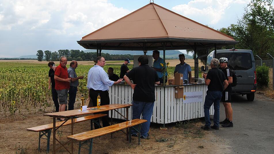 An dem Stand luden Rudolf Schaller und Herbert Pfriem von der Erzeugergemeinschaft für Qualitätsgetreide und Sonnenblumenkerne Kitzingen und Umgebung w.V. zu einer regionalen Bratwurst ein. Pascal Böhnlein (im Vorstand Bauernverband) servierte dazu frisches Baguette, das mit dem Sonnenblumenöl der Erzeugergemeinschaft beträufelt war, und zu trinken ein „Achterle“ Rotling oder eine Silvanerschorle vom regionalen Winzerhof Harald Geißendörfer Buchbrunn. Dazu gab es Informationen über die hiesige HO-Sonnenblume (High-Oleic = hochölsäurehaltig).