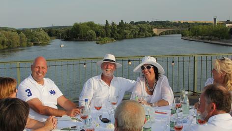 Die Kulisse war perfekt: Wo sonst Fußgänger und Radfahrer die Mainbrücke überqueren, standen festlich gedeckte Tische mit eleganten weißen Tischdecken und weiß überzogene Stühle. Das Brückengeländer war mit großen, weißen Luftballons geschmückt. Auf den Brückenpfeilern befanden sich weiße Pavillons, in denen Speisen zubereitet und Getränke ausgeschenkt wurden.