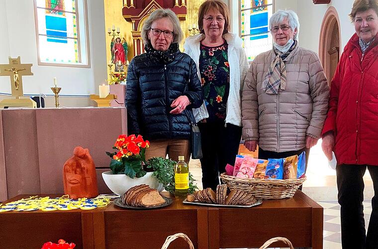 Eine Skulptur, wo der heilige Josef einen Schutzmantel über seine Frau Maria und das Jesuskind legt, war Mittelpunkt des März-Gottesdienstes der Euerfelder Senioren. Besorgt um seine Lieben hat er seine Familie sicher nach Ägypten gebracht und ist, als die Gefahr vorbei war, wieder in die Heimat zurückgekehrt. Bewegt hörten die Anwesenden die Texte und beteten um den Frieden in der Ukraine, auf der ganzen Welt, aber auch in den Orten und Familien. "Wenn das Salatöl, das wir teilen", dafür stand eine Flasche der Rarität "Sonnenblumenöl vor dem Altar und in Anlehnung an das Lied 'Wenn das Brot, das wir teilen' ein Schwarzbrot, "dann beginnen wir mit einem liebenden, helfenden Blick die Not der Menschen um uns herum zu lindern", so Diakon Kleinschnitz, der den Gottesdienst leitete, bei seinen Gedanken zur Notwendigkeit dieser Zeit. So gilt es neben der Willkommenskultur für die Unterkunft suchenden Flüchtlinge auch den Blick auf das Teilen in einem verringernden Angebot in den Supermärkten nicht aus den Augen zu verlieren. "Ich glaube, dass Gott uns in jeder Notlage so viel Widerstandskraft geben will, wie wir brauchen, dass er auf aufrichtige Gebete und verantwortliche Taten wartet und antwortet." Das Gebet von Dietrich Bonhoeffer von 1943 spannte sich wie ein großer Bogen über den Gottesdienst zum Josefstag 2022. Musikalisch begleitete Katharina Ländner Mack an der Orgel die Feierstunde. Eine Friedenstaube in den Ukrainischen Farben, eine Scheibe Brot und ein "Voraus-Osterpräsent" durfte jeder der Gottesdienstbesucher mit nach Hause nehmen.