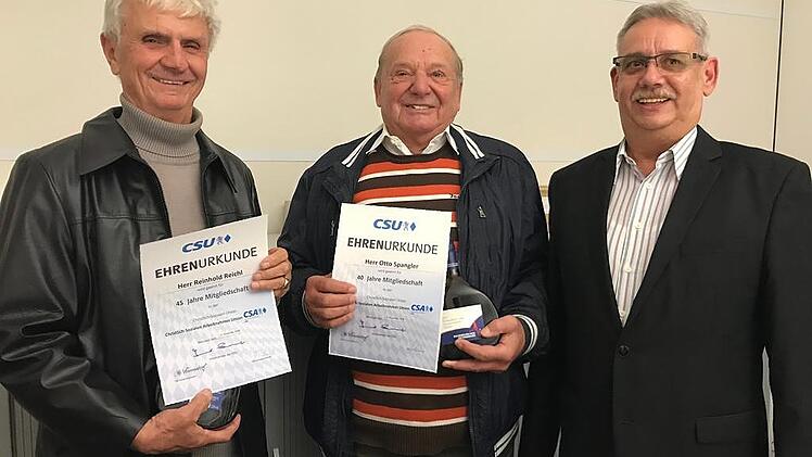 Kreisvorsitzender Robert Winter dankte dem langjährigen Schatzmeister Karl Klotz für seine über 40-jährige Tätigkeit und überreichte einen Bockbeutelgruß und Blumen. Für 40-jährige Mitgliedschaft wurde Altbürgermeister Otto Spangler und für 45-jährige Mitgliedschaft der Ehrenkreisvorsitzende Reinhold Reichl geehrt.