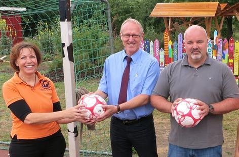 Mit fairen Fußbällen kicken probeweise die Schüler der Wiesentheider Nikolaus-Fey-Schule. Helma Schug (links) vom Wiesentheider Weltladen hat Schulleiter Heinz Dürner (Mitte) zwei sogenannte „faire Frankenbälle“ aus dem Ladensortiment zum Testen überlassen.