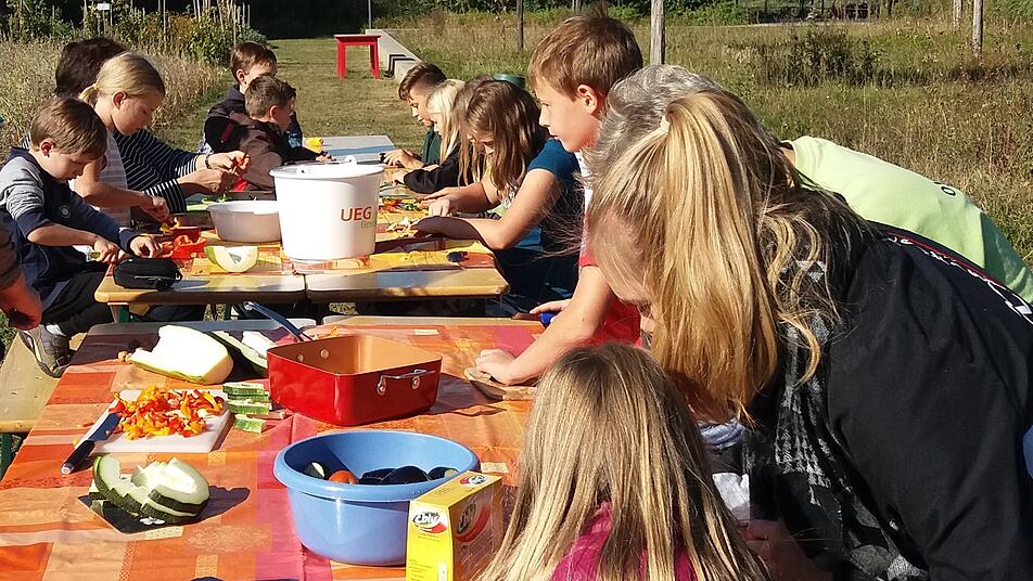 Begeistert fanden die Kinder auf der Kreisacker-Fläche einiges an Gemüse wie Auberginen, Zucchini, grüne Paprika oder Lauch. Damit die Kinder ihre Ernte sofort genießen konnten, hatten ihre Betreuerinnen einen riesigen Kochtopf samt passendem Kochlöffel und Gaskocher mitgebracht. Das Wetter spielte mit, so dass die fleißigen Gärtner bei guter Laune Zucchini und Auberginen an Biertischen direkt neben dem Kreisacker klein schnippeln konnten.
