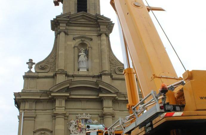 Die Verantwortlichen entschieden sich dafür, einen großen Kran zu bestellen, der die Spezialisten in einer dort angehängten Gitterbox nach oben hebt. Die Zeiger wurden abgenommen, dann wurde von innen repariert und erneuert. Statt einen Antrieb für alle Uhren hat nun jede ihren eigenen Antrieb. Als alles wieder hergestellt war, galt es, die Zeiger wieder anzubringen. Auch nicht leicht, denn sie mussten erst durch das von unten kaum sichtbare Netz zum Taubenschutz gefädelt werden, ohne das Netz zu beschädigen.