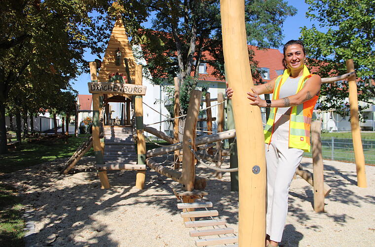 Rutschen, Schaukeln, Klettern, Balancieren, Toben und sich Ausruhen: All das hat Anna Goldschmidt in ihren Überlegungen bedacht. Die Pläne für die Spielgeräte hat sie selbst entworfen. „Alles Unikate“, sagt sie mit einem Lächeln. Im Mittelpunkt des Spielplatzes steht die „Drachenburg“, die von den Kindern sicher schnell in Beschlag genommen wird. Auf einem weiteren Spielgerät können die Kleinen gleichzeitig sitzen und balancieren und ein paar Meter weiter können sie durch einen Tunnel krabbeln. „Oder sich dort verstecken“, sagt die dreifache Mutter und lacht. Ihre Kinder haben die Pläne als erstes gesehen – und für gut befunden.