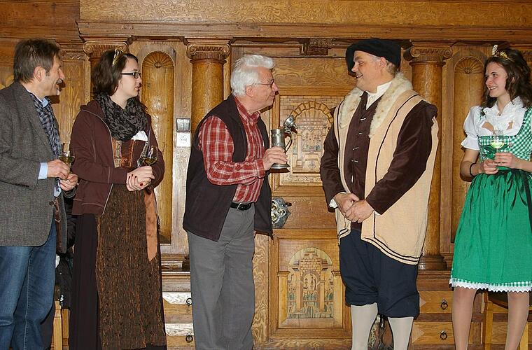 Kalle macht sie alle Es war auch deshalb ein nicht ganz alltäglicher Hofratsempfang, weil einer aus der Gruppe der Gäste dem historischen Spiel seinen Stempel aufdrückte. Kalle Deh aus Hamburg wurde gebeten, mit einem Schluck aus der Kandel stellvertretend für alle Gäste den Wert des Weines zu bestätigen. Dieser ließ sich nicht lumpen, setzte an und leerte den Humpen auf einen Schluck.