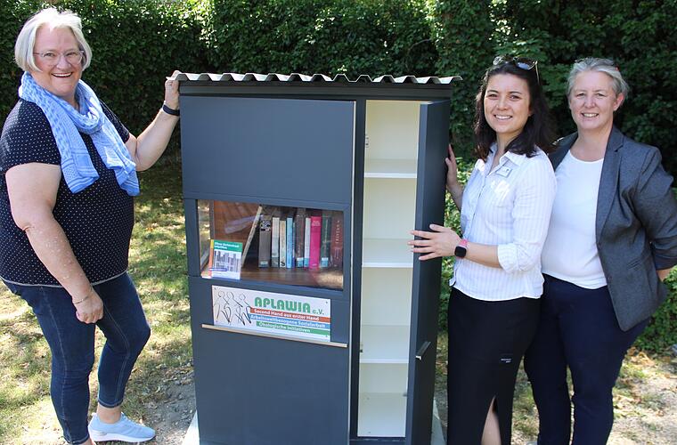 Sie freut sich über die unkomplizierte Zusammenarbeit mit der Aplawia. Aus einem alten Schrank bauten die Mitarbeiter ein sehenswertes Exemplar, das dank eines kleinen Daches auch Regenfälle gut überstehen sollte. Bücherei- Leiterin Sheena Ulsamer wird sich um die erste Bestückung des Schrankes kümmern und immer wieder nach dem Rechten schauen. Wie immer gilt: Jeder darf sich bedienen und die Schränke mit eigenen Büchern bestücken.