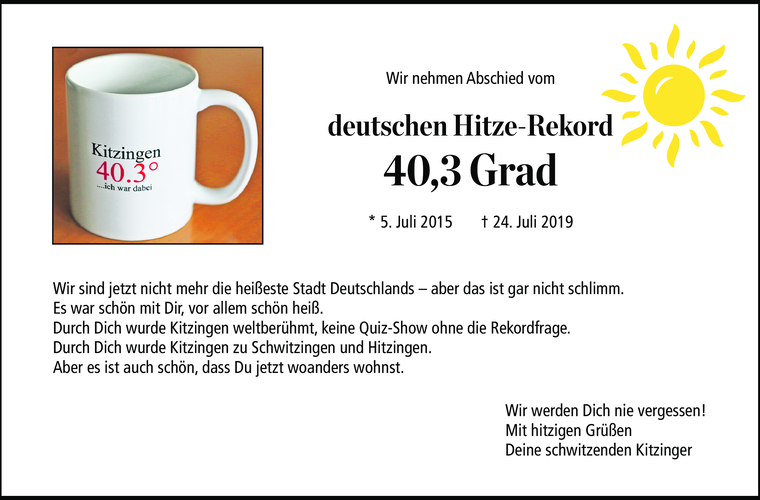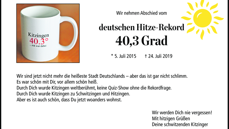 Vier Jahre hat er gehalten, der Kitzinger Hitze-Rekord. Jetzt zieht er weiter nach Westen. Wir können gut damit leben. Aber ein kleines Abschiedsgeschenk haben wir noch.