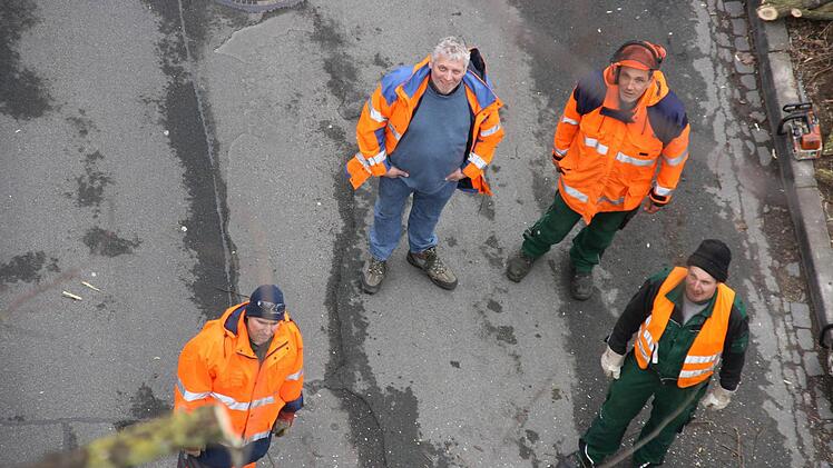 Während Matthias Hofmann den Akazien ihre "Sommerfrisur" verpasste, beseitigten Ansgar Geiger und Norbert Michels das abgeschnittene Holz. Auch in den kommenden Tagen werden die Stadtgärtner unterwegs sein, "damit den Leuten keine Gefahr von oben droht."