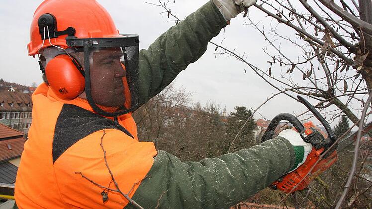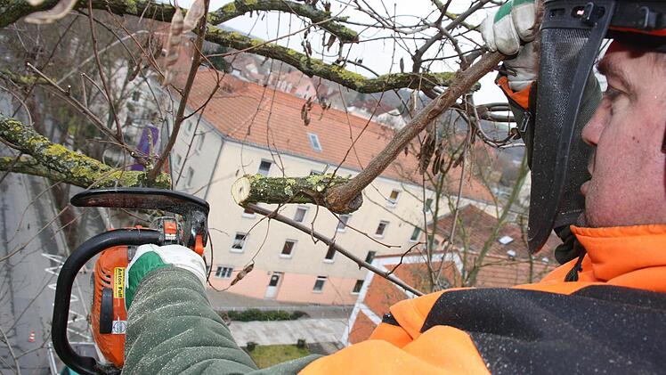 Brum. Brum. Brummmm. Der Motor heult auf. Die Blicke der Passanten in der Kanzler-Stürtzel-Straße gehen - Richtung Himmel. Denn der Motor gehört nicht zu einem Fahrzeug, sondern zu einer Kettensäge. Und die bedient Matthias Hofmann in zirka 15 Metern Höhe.