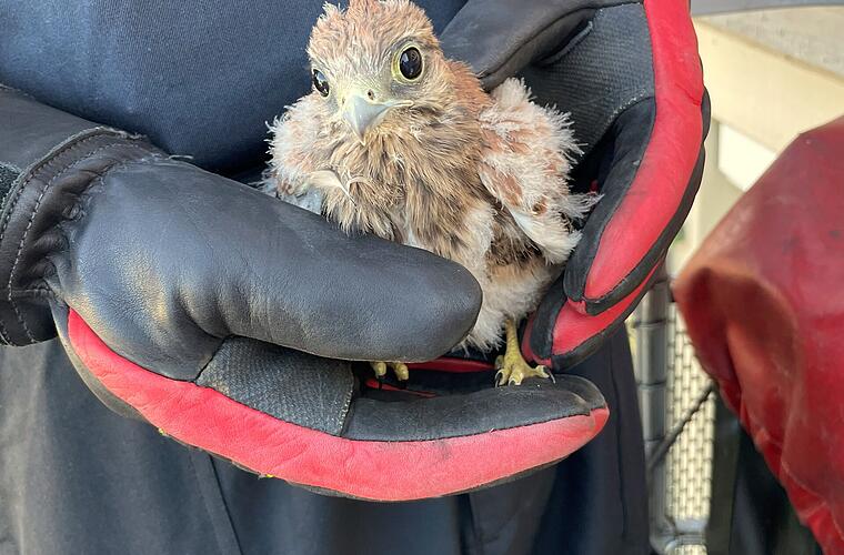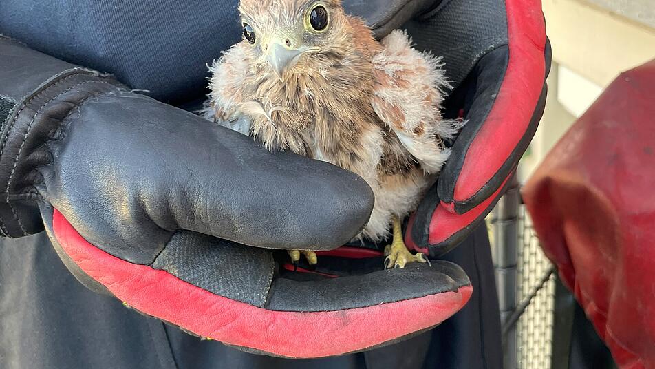 Einen jungen Falken rettete die Stadtfeuerwehr Kitzingen. Folgende Infromationen sind einer Pressemitteilung der Feuerwehr entnommen. Ein Passant hatte telefonisch die Retter informiert, dass ein junger Falke aus seinem Nest auf den Boden gefallen sei.