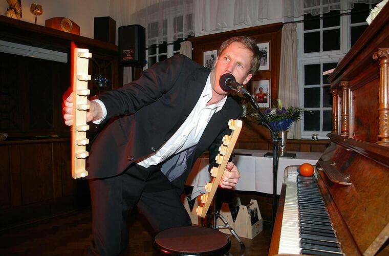Beeindruckende Wortakrobatik Tradition war auch das Stichwort für das Abendprogramm des Neujahrsempfangs. Nach der mitreißenden Darbietung beim letzten Neujahrsempfang wurde erneut der Klavierkabarettist Tom Wende eingeladen, zwischen den Tasten des Klaviers zu rudern. Der tat dies mit beeindruckender Wortakrobatik, präsentierte seine eigene Geschichte im Verein als Musikstück und jonglierte am Klavier mit allerhand Objekten. So spielte er den Beatles-Hit "Let it be" mit einer eigens angefertigten Tastenlatte, klemmte sich bei Chopin eine Orange unter die Hand oder bediente parallel zum Klavier noch ein Schlagzeug.