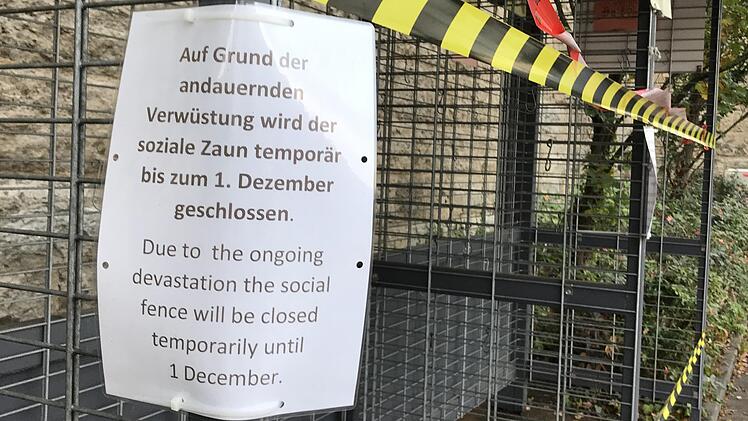 "Auf Grund der andauernden Verwüstung", so steht es auf dem im Wind an einem schwarz-gelben Absperrband baumelnden Zettel, "wird der soziale Zaun temporär bis zum 1. Dezember geschlossen." Die gähnende Leere herrscht an dem ungewöhnlichen Zaun am Rande des Hofs des Kitzinger Feuerwehrhauses in der Landwehrstraße schon einige Wochen: "Wir haben den Zaun für drei Monate gesperrt", sagt Uwe Hartmann. Der Stadt- und Kreisrat der Bayernpartei ist so etwas wie der Erfinder des Zaunes: Durch seine Initiative wurde die Einrichtung im Jahr 2016 geschaffen.