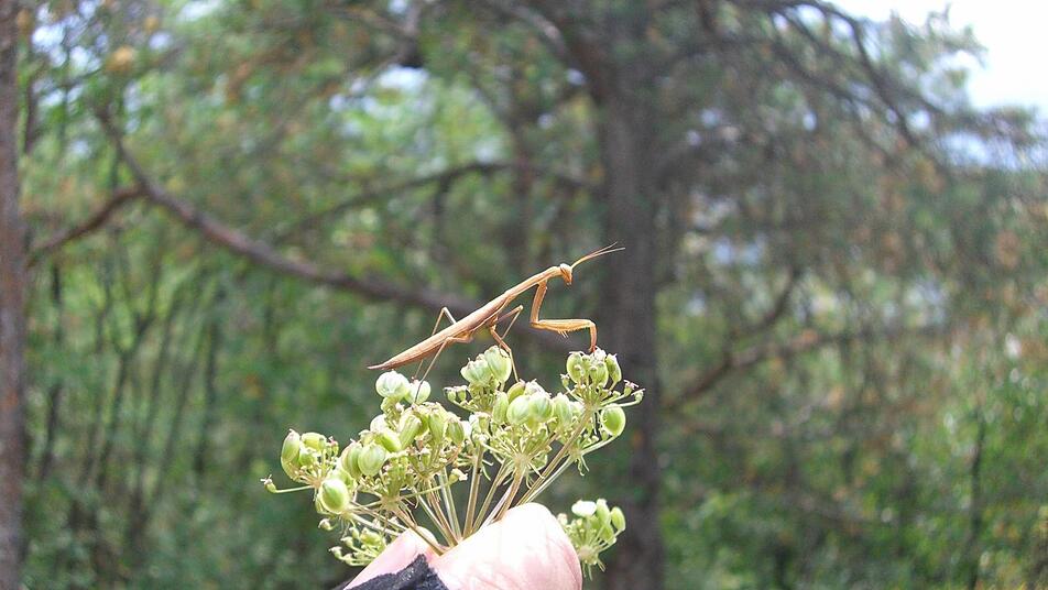 Matthias: (grinst) Naja, zum Beispiel sind wir früh um 11 Uhr einem Nacktwanderer begegnet. Der hatte nur einen Wanderstock dabei... Außerdem gab's tierische Begegnungen, zum Beispiel mit einer Gottesanbeterin.