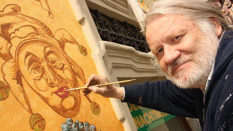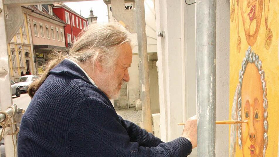 Die aktuelle Attraktion Kitzingens sitzt auf einer Holzkiste, die auf einem Gerüst in der Luitpoldstraße steht. Künstler und Bürgermeister Klaus Christof gestaltet die Fassade des Fastnachtmuseums - sofern er wegen der vielen Schaulustigen zum Arbeiten kommt.