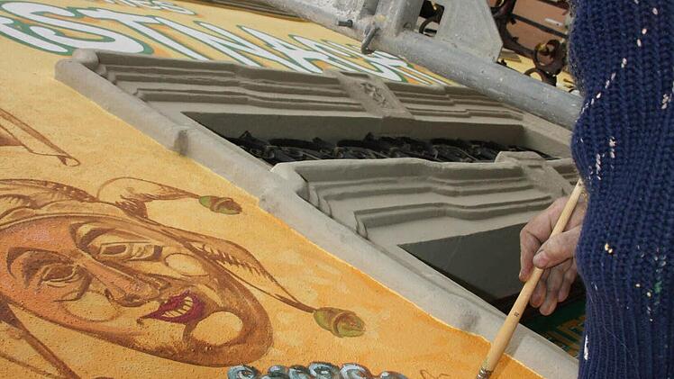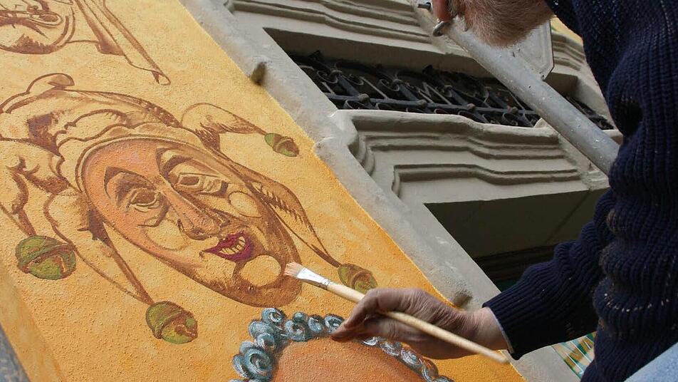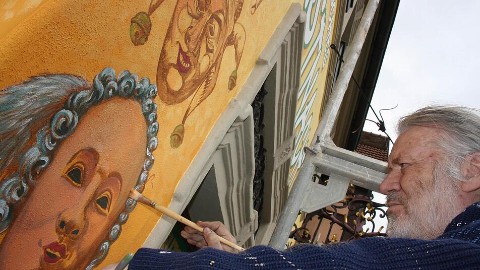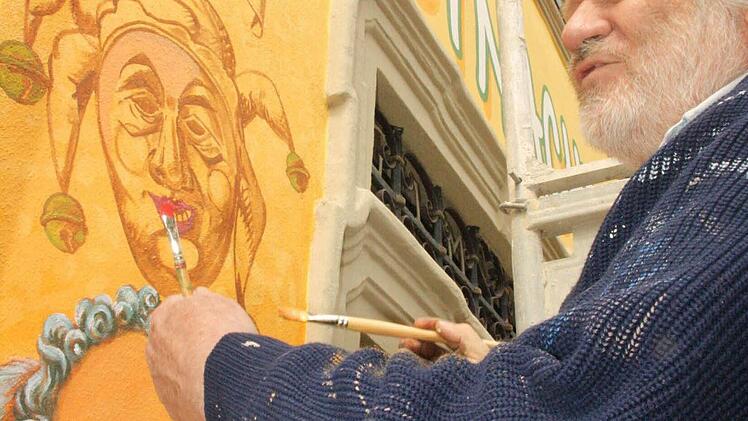 Während der Arbeit wird Klaus Christof normalerweise nicht von derart vielen Blicken begleitet. Sowohl Fremde als auch Bekannte bleiben in der Kitzinger Luitpoldstraße stehen und schauen hinauf zum malenden 1. Bürgermeister. Der 64-Jährige gibt der Fassade des neuen Deutschen Fastnachtmuseums ein ganz individuelles Gesicht - oder besser: 13 Gesichter. So viele Faschingsmasken werden künftig die untere Eingangstür des Museums bewachen.
