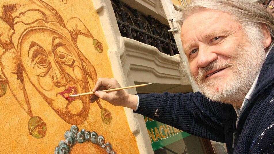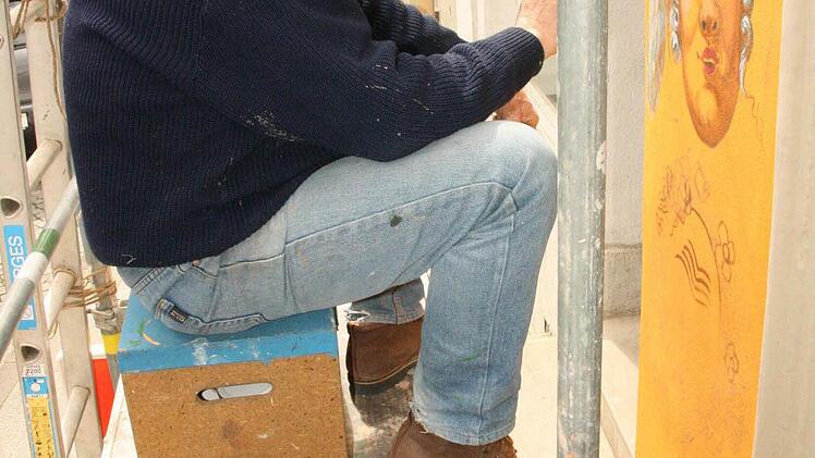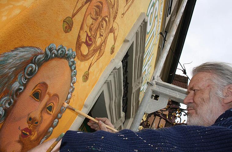 "Hast' Hunger?" Von unten, vom Gehsteig her, schwingt sich die Frage hinauf in Klaus Christofs Ohren. Der Künstler zieht den Pinsel zurück und blickt von dem Gerüst herab, auf dem er gerade arbeitet. Er schüttelt den Kopf, als das Paar, das unten steht, ihm eine Leberkäs-Semmel anbietet. "Danke, nein. Ich ess' nix, wenn ich schaff'."