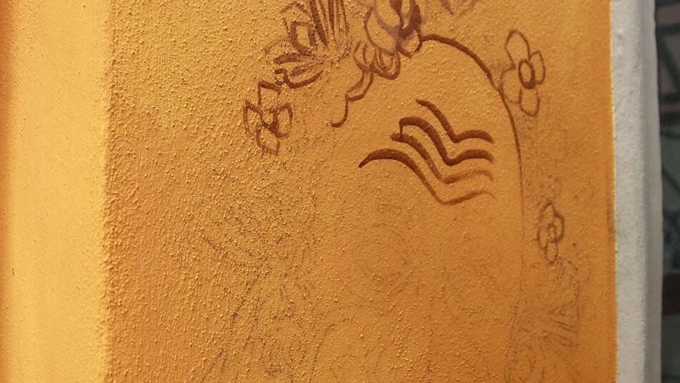 Es sind dekorative Masken aus ganz Deutschland, die Christof daheim in seiner Atelier-Werkstatt erst auf Backpapier gezeichnet und dann "durchgerädelt" hat. Das heißt, er hat das Papier - ähnlich wie ein Schneider seinen Stoff - mit einem Loch rädchen bearbeitet. "Wenn man das dann gegen die Wand hält und Asche darauf gibt, dringt die Asche durch die Löcher", erklärt Christof. So gelangt die erste Skizze an die Wand.