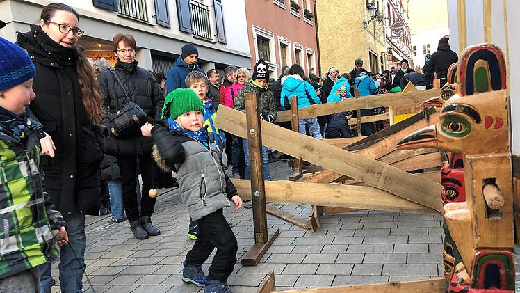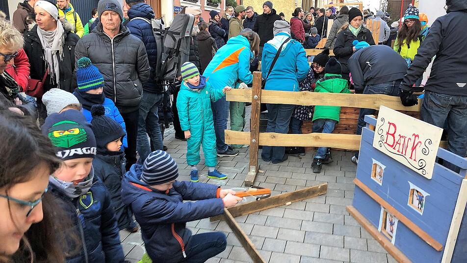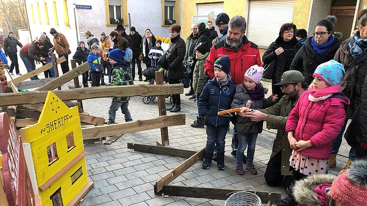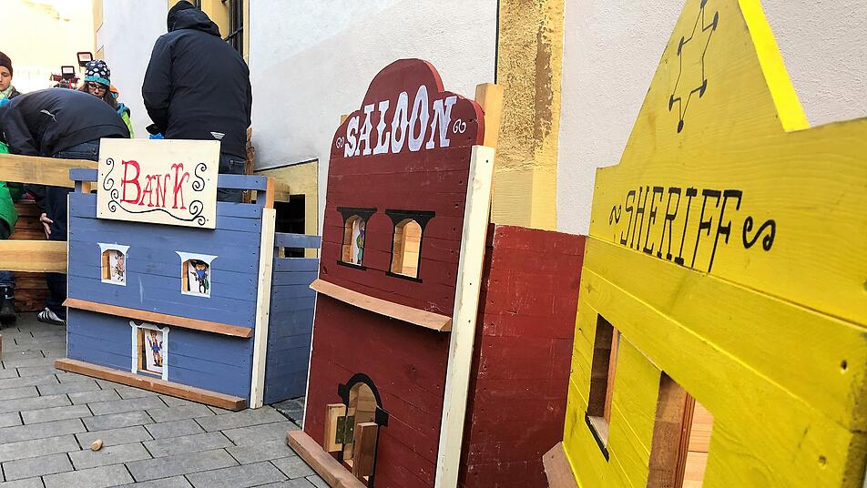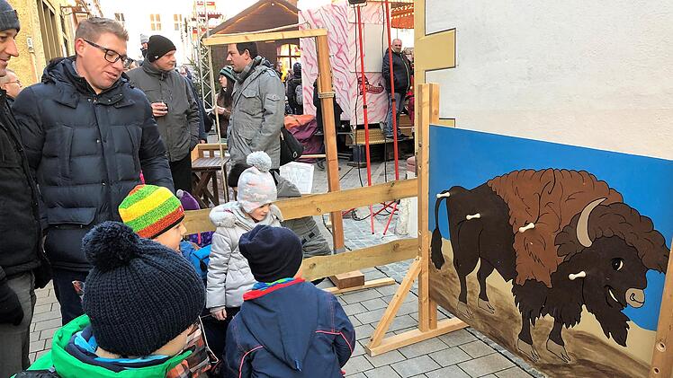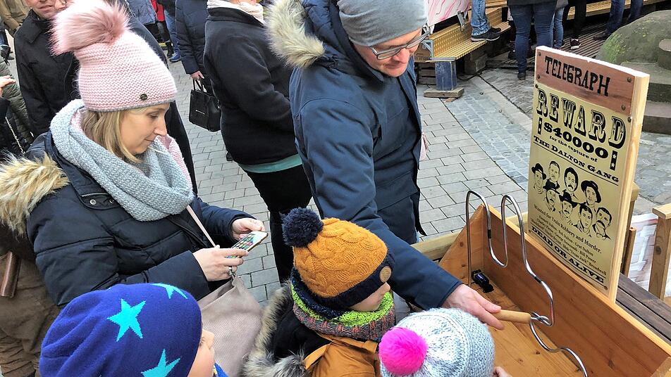 Während sich am Nachmittag der Platz um den Marktbrunnen gut gefüllt hatte, waren die Familien mit Kindern vor allem in der Georg-Berz-Straße zu finden. Dort war ein Spieleparcours aufgebaut, der die kleinen Abenteurer regelrecht in seinen Bann zog. Mit Korken aus der Armbrust durften die dreisten Bankräuber in der Westernstadt gezielt bekämpft werden. Treffsicherheit war gefragt beim Werfen der Ringe auf die Hörner des Bisons. Auch beim Schmeißen der Hufeisen und bei der Jagd nach der ausgesetzten Belohnung war ein ruhiges Händchen wichtig.