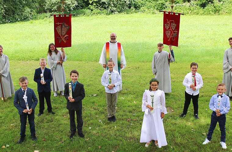 Ein schöner großer Platz, unter freiem Himmel, mitten im Grünen, einen Tag vor Sommeranfang, im Schatten großer Bäume und hier dann Kommunion feiern dürfen, ja fast traumhaft könnte man sagen und alles „Dank“ Corona. Wo normal das Obervolkacher Weinfest stattfindet, wurde am vergangenen Sonntag Festgottesdienst gefeiert im Rahmen der ersten heiligen Kommunion. Ein Mädchen und sechs Buben aus den Pfarreien Gaibach, Rimbach, Krautheim und Obervolkach gingen zum ersten Mal zum Tisch des Herrn. Die Idee die Feier ins Freie zu verlegen und die aktuell sehr niedrige Inzidenz im Landkreis Kitzingen ermöglichten so, den gesamten Gottesdienst ohne Maske feiern zu dürfen, allein deshalb hat sich der Weg nach draußen mehr als gelohnt. Der Gottesdienst, der unter dem Motto stand „Jesus, wo wohnst Du?“ wurde von Pater Isaak Grünberger aus Münsterschwarzach wunderschön, lebendig zelebriert. In seiner Predigt ging er darauf ein, dass Jesus eigentlich überall wohnt, er überall anzutreffen ist und man so eigentlich jeden Tag und zu jeder Zeit quasi Gottesdienst mit Jesus feiern kann, egal wo man ist und was man gerade tut. Musikalisch hervorragend gestaltet wurde die Feier vom Ehepaar Kathrin (Gesang) und Raffael Di Gioia (Piano und Gesang), die an diesem Tag nicht nur für gute Musik sorgten, sondern gleichzeitig auch Kommunioneltern waren für ihre Tochter Emilia, die die erste Heilige Kommunion empfing.