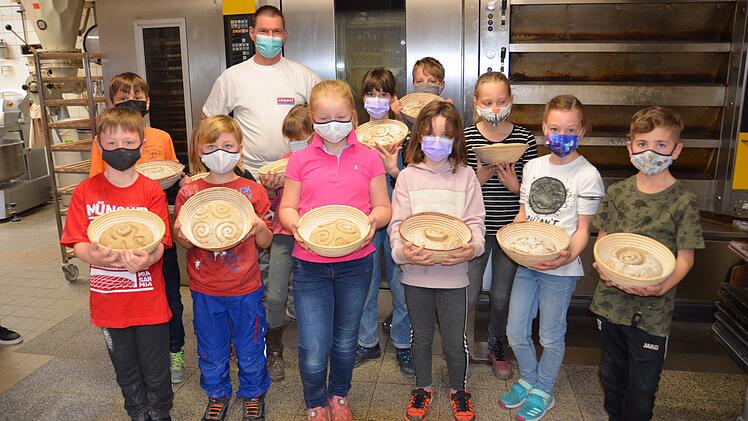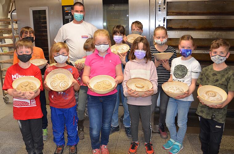 Die zwölf Kommunionkinder aus Iphofen durften während der Vorbereitung auf die Erstkommunion die Bäckerei Brönner besuchen. Unter Anleitung des Bäckermeisters Florian Lenzer erfuhren die Kinder alles rund um das Thema Brot und durften aus Sauerteig einen eigenen Brotlaib formen. Frisch gebacken und herrlich duftend konnte jedes Kind sein Brot mit nach Hause nehmen. Ein Laib Brot wird für die Feier der Erstkommunion aufbewahrt und bei der Gabenbereitung zum Altar getragen.