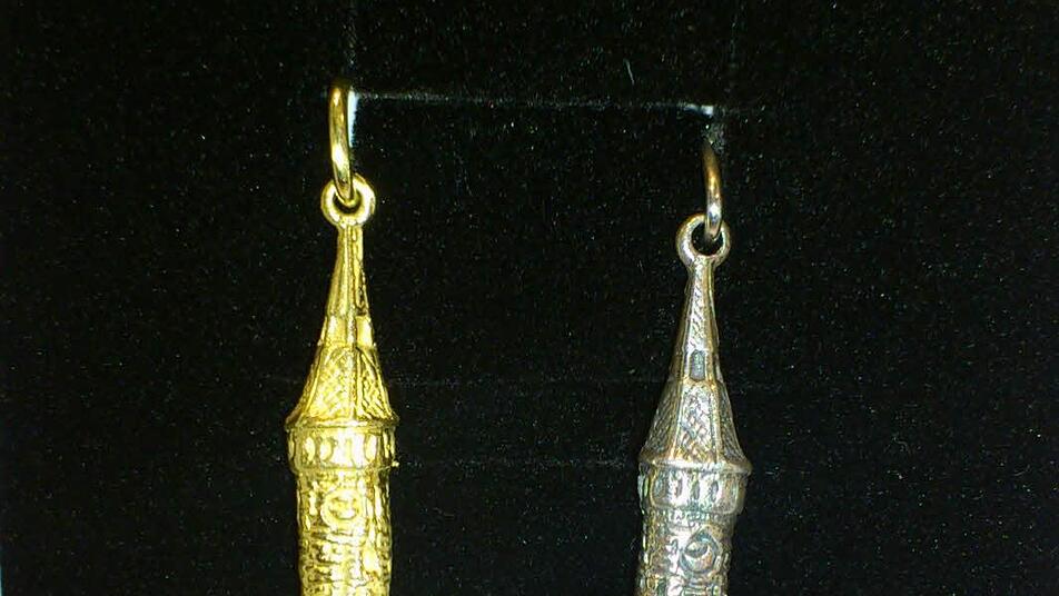 Im Nachbarhaus, beim Juwelier Herbach, prangen Falterturm und Stadtsilhouette auf Gold- und Silbermünzen. Zudem schmückt der schiefe Turm als Anhänger Hand oder Hals modebewusster Menschen.