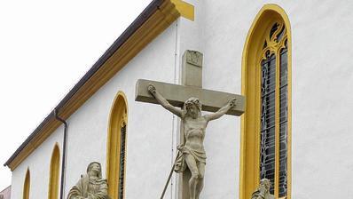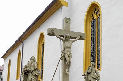 Die Escherndorfer Kreuzigungsgruppe erstrahlt nach der Renovierung in neuem Glanz – und an einem neuen Platz. Standen die Figuren vorher rechts neben der Pfarrkirche St. Johannis, stehen sie jetzt links und sind Bestandteil des neugestalteten Dorfplatzes.