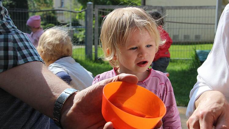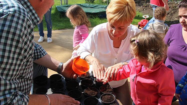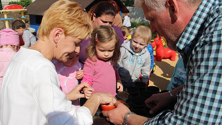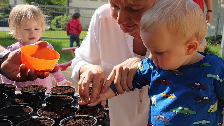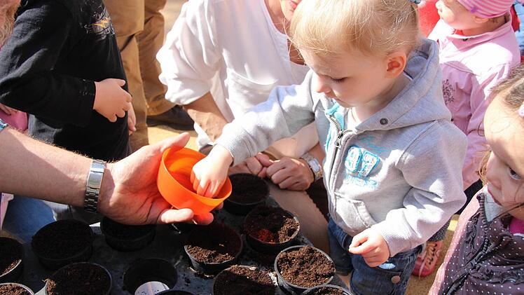 Die Kitzinger Kinderkrippe Sternkinder war gleich dabei: "So lernen die Kinder, was zwischen Kern und Frucht passiert", sagt die Leiterin Annett Kießlich. "Sie sehen, wie die Pflanze wächst." Die 27 Kinder sind zwischen einem und zweieinhalb Jahren alt.