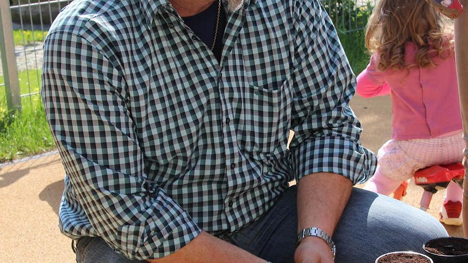 Stadtgärtner Johannes Lindner hat 30 Pflanztöpfe voller Erde mit in die Kinderkrippe gebracht. Auch Samen für Sonnenblumen und Kürbisse hat er dabei. Er ist unterwegs in Kitzinger Schulen und Kindergärten, um "gemeinsam aufzublühen". Im Rahmen des Wettbewerbs "Entente Floral" soll die Stadt "vor allem grüner" werden.