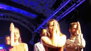 „Alle Zeit der Welt“ musste man schon vor der Eingangstür zum Kellergewölbe aufbringen, bevor es richtig losging. Immerhin hatte der Regen nachgelassen, bis die vielen Gäste eingelassen wurden – freundlich empfangen mit einem Glas Secco. Dann wird es dunkel: Schwarze Bühne, roter Teppich. „Komm mit uns, verschwende deine Zeit!“, der Song von den Toten Hosen kommt laut aus der großen Anlage. Die fünf Akteure bewegen sich dazu in Zeitlupe und strahlen Ruhe aus. Sie haben auch Zeit, abwechselnd Franken-Secco auszuschenken – oder auch nicht, dann ist die Bar geschlossen.