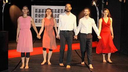 Sie rezitieren „Ich folge nur den Launen des Augenblicks“. Ein leichtfüßiges Kommen und Gehen, rote Kleider, Anzug, mal mit Schuhen, mal ohne, mit Täschchen oder Mantel, ein Blumentanz zu „Volare“, gestenreich gespielt. Zu einer Arie aus Händels Oper Xerxes sieht man im Hintergrund als Video den Kitzinger Weinlandkreis. Und noch ein Spiel: Kennen wir uns? Nein, wir gehen weiter, immer schneller.