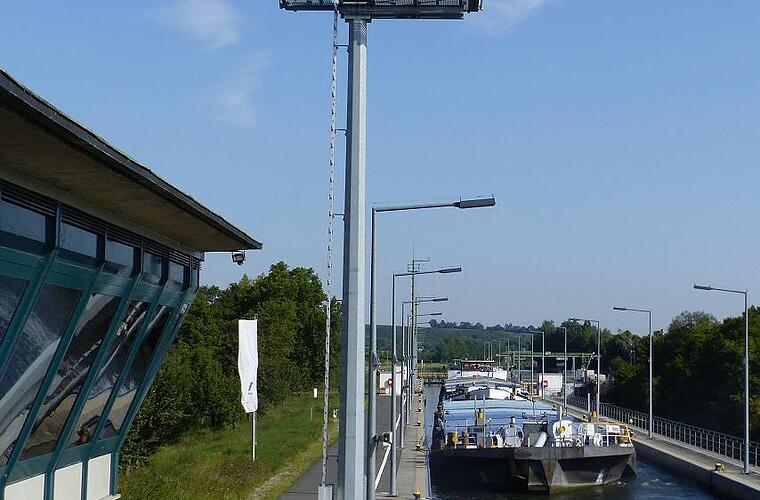 Andreas Gerlach und Christian Rüth haben gerade Frühschicht in der Zentrale. Dort sind kreisförmig vier Arbeitstische mit diversen Bildschirmen und Computern aufgereiht. Jede Schleuse hat ihren eigenen Tisch. Von hier aus kann über Kameras der gesamte kommende und gehende Schiffsverkehr beobachtet werden. Über gesonderte Funkfrequenzen kann der Diensthabende auch jederzeit dem Kapitän Kommandos geben. „Wir können in einer Schleuse maximal zwei Güterschiffe unterbringen“, erklärt Gerlach.