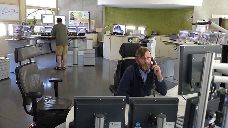 Die Leitzentrale hat es aber nicht nur mit Schleuseneinsätzen zu tun. Christian Rüth berichtet von einem ganz aktuellen Fall aus Volkach: In der Nacht zum Weinfestmontag hatte er Dienst. Kurz nach Mitternacht kam über die Rettungsleitstelle die Mitteilung, dass bei Volkach vermutlich eine Person ins Wasser gefallen sei und eine groß angelegte Rettungsaktion anläuft (wir berichteten). Rüth wusste, dass kurz vorher drei Fahrgastschiffe die Schleuse Wipfeld passiert hatten und in Richtung Volkach unterwegs waren. Zugleich war in Gerlachshausen ein Güterschiff in der Schleuse, welches in Richtung Schweinfurt bergaufwärts – wie es im Schiffsjargon heißt – losfahren wollte.