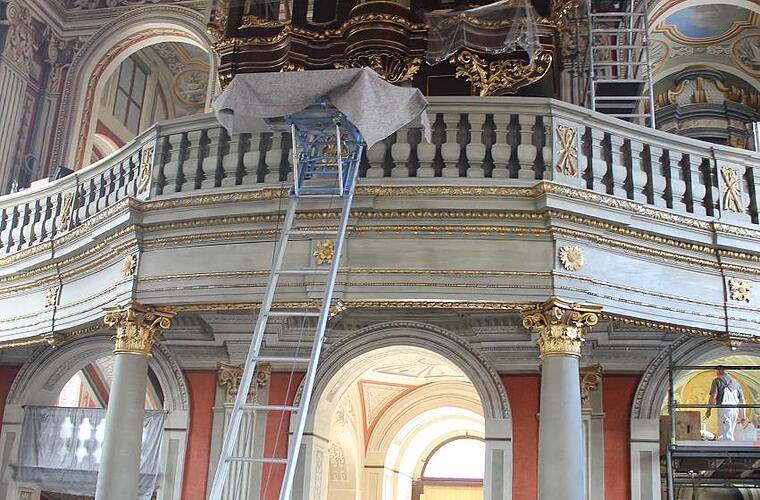 Auch an den Logen, den so genannten Grafenstühlen, haben die Holz-Restauratoren gewerkelt. Sie wurden etwa um einen halben Meter in Richtung Chorraum versetzt, dazu kamen die Schiebetüren raus und wieder welche mit dem Mechanismus zum Aufklappen hin, wie einst. „Es ist ja unser Beruf, zu schauen, wie es früher war und das zu erhalten. Wir sollen möglichst keine Sachen dazu erfinden“, berichtet Demeter. An den Seitenaltären hat er mit seinen Leuten manches ausgebessert, ebenso an der Kanzel. Es galt, den Holzwurm zu vertreiben. Viel loses Furnier, Verschmutzungen und einige Fehlstellen habe man beseitigt.