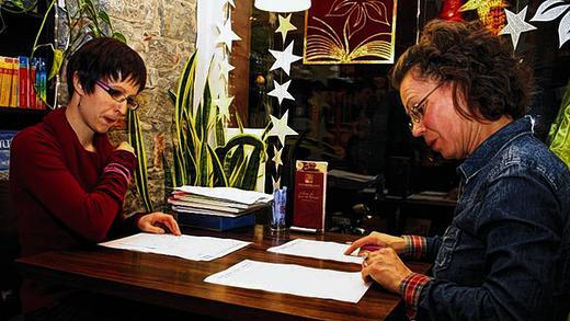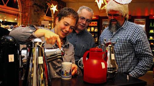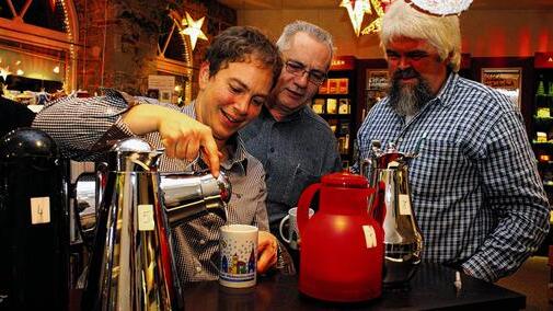 „Das Buffet ist eröffnet.“ Die Buchladeninhaberinnen Sabine und Eva Kiesel sowie Vorproben-Organisatorin Anita Krämer-Gerhard haben acht Thermoskannen auf die Anrichte gestellt: Jede aufgeklebte Nummer steht für einen Marktstand, an dem der Wein verkauft wird. Blindverkostung ist angesagt: Beim Probieren soll keiner der elf Teilnehmer wissen, ob er gerade einen vom Nebenmann produzierten Glühwein verköstigt. Heiß diskutiert wird trotzdem: „Der Fünfer schmeckt leicht“, „Hast du auch gerade den Dreier in der Tasse?“ und „Ich komm nicht klar mit dem Zweier, der ist mir zu herb“. Die Urteile sind so unterschiedlich wie offenbar die Weine.