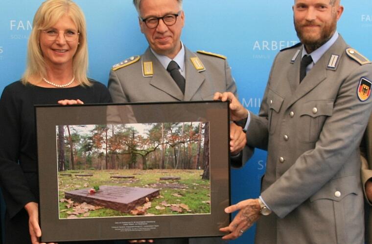 Eine besondere Würdigung erhielt das Logistik-Bataillon Volkach kürzlich im Bayerischen Staatsministerium für Familie, Arbeit und Soziales. Staatsministerin Ulrike Scharf und Volksbund-Landesvorsitzender, Regierungspräsident a.D. Wilhelm Wenning, dankten Stabsunteroffizier Sebastian Klein stellvertretend für die fünfte Kompanie des Logistik-Bataillons für die Unterstützung der Kriegsgräbersammlung im vergangenen Jahr und übergaben als Erinnerung eine großformatige Aufnahme des Waldfriedhofs Halbe. Das geht aus einem Presseschreiben des Bezirksverbandes hervor, dem folgende Informationen entnommen sind: