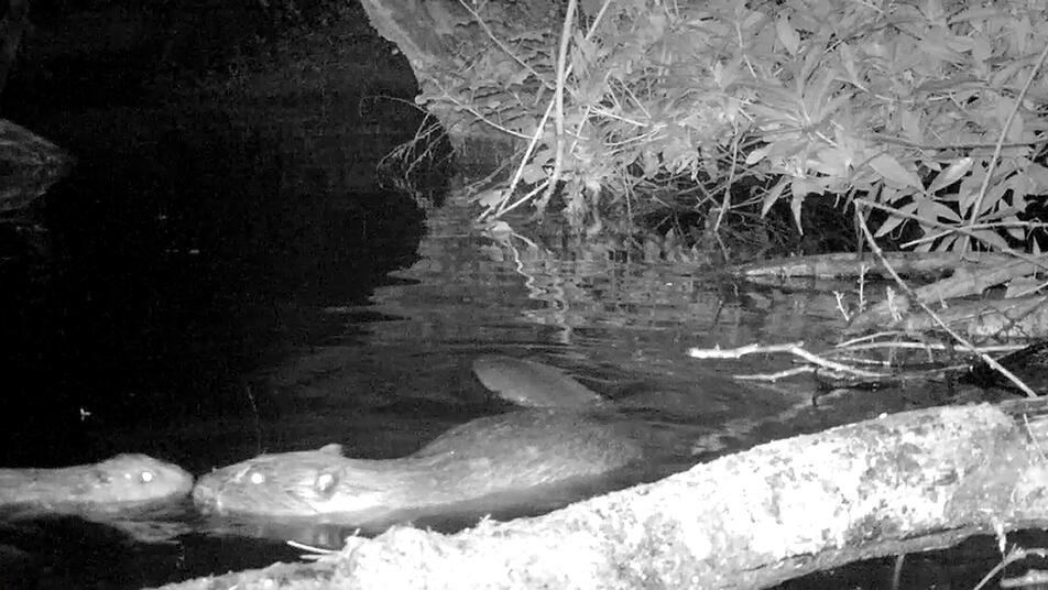 Großbritannien, Holnicote Estate: Ein Biberbaby (l) schwimmt zusammen mit seiner Mutter auf dem Gelände des Holnicote Estate, einer Naturschutzorganisation in der englischen Grafschaft Somerset.