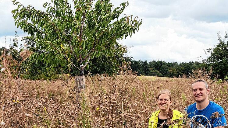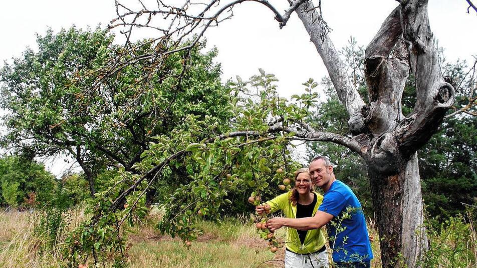 Die junge blonde Frau lacht, als sie den riesigen blauen Korb im Kofferraum ihres Kombi sieht. „Der ist, glaube ich, ein bisschen zu groß“, sagt Anna Sophia Feuerbach und blickt in Richtung des Birnbaumes, den sie zusammen mit ihrem Partner Jürgen Knorr gleich ableeren will. Zehn bis 15 Früchte hängen an dem vor drei Jahren gepflanzten Obstbaum – zu wenig für den großen Korb. Der wird an diesem Nachmittag aber trotzdem noch gefüllt werden. Die Apfelbäume auf der Streuobstwiese in der Volkacher Struth versprechen nämlich eine ordentliche Ernte.