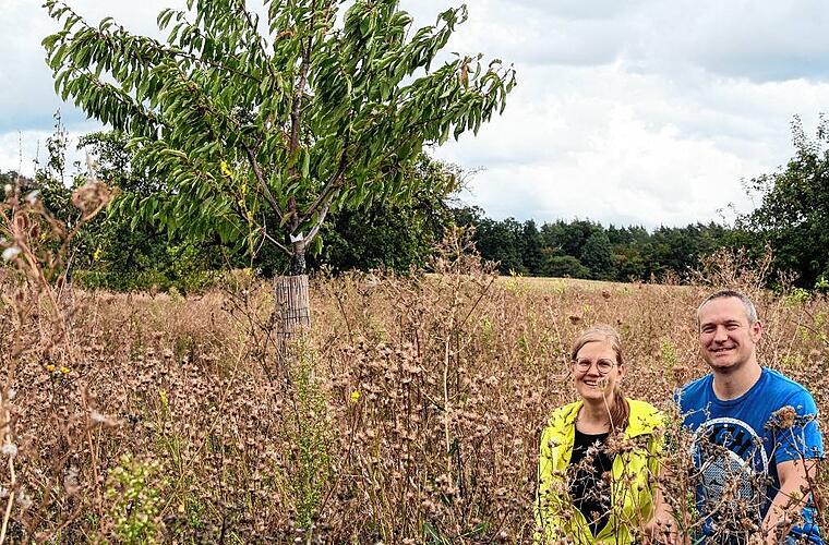 Anna Sophia kann das bestätigen. Allerdings habe in den letzten Wochen das Wasser gefehlt, so dass die Bäume zwar viele Äpfel tragen, sie aber nicht mehr so groß geworden sind. Dem Geschmack tut das natürlich keinen Abbruch. In die Früchte von der Streuobstwiese beißt nicht nur das Besitzerpaar mit gutem Gewissen hinein. In ihrem Fürther Wohnhaus versorgen die 34-jährige studierte Biochemikerin und der aus Dettelbach stammende Maschinenbauer die gesamte Nachbarschaft mit Äpfeln, Zwetschgen und Nüssen. Anna Sophia Feuerbach investiert viel Zeit in die Bewirtschaftung des Grundes, kommt zur Erntezeit jedes Wochenende in ihre alte Heimat. Auch das Mähen und Schneiden macht ihr Freude. Das Paar sieht es als willkommene Abwechslung zur überwiegend sitzenden – und in Anna Sophias Fall auch sehr kommunikativen – Tätigkeit und überlegt gerade, sich entsprechende Maschinen anzuschaffen. „Ich genieße die Ruhe sehr“, sagt die Selbstständige im Bereich psychische Gesundheit lächelnd. „Es ist schön, wenn man einfach mal nicht reden muss.“