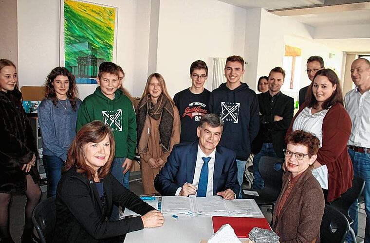 Die Firma Knauf und das Armin-Knab-Gymnasium unterschreiben einen Kooperationsvertrag.