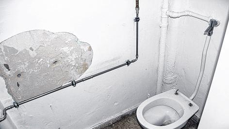 Wir sind an einer Treppe angelangt, die zu einer stählernen Haustür führt. „Don't eat yellow snow“ (Esse keinen gelben Schnee) hat jemand an die Wand gepinselt. Philipp Sell stellt den Rollator neben der Treppe ab – die paar Stufen schafft er noch ohne. Zum Glück. Denn das so genannte Bad, das sich rechts hinter seiner Wohnungstür auftut, ist so winzig, dass man es mit Rollator nicht betreten könnte. Die einzigen Gegenstände in dem Kabuff, von dessen Wänden der Putz abplatzt, sind eine Toilette ohne Sitz und gegenüber ein kleines Waschbecken. Einen Boiler für Warmwasser oder gar eine Dusche gibt es nicht.
