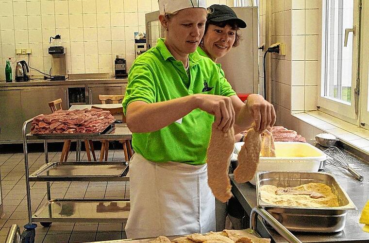 Birgit Geiling rührt in einer großen Wanne Zucker in den Joghurt fürs Dessert. „Probier' mal“, sagt sie zu Margit Rössert, „passt das?“ Rössert holt einen Löffel, kostet, nickt zustimmend. „Passt.“ Wenige Meter weiter legt Corinna Schmitt die ersten Schnitzel in die beiden „Kippen“, die riesigen Bratpfannen, die erst vor einem Jahr neu angeschafft wurden. „Wir haben schon eine super Küche hier“, sagt Sonja Greb. Da macht die Arbeit sichtlich Spaß.