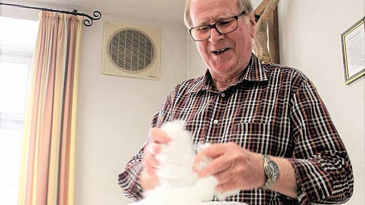 „Unser Mann“, damit ist Friedemann Schilling gemeint, Marianne Schillings Ehegatte. Der steht hinter einem eigenen Pult, vor sich einen riesigen Berg weißer, fluffiger Füllwatte und eine Waage. Für jedes Herz wiegt er genau 125 Gramm der flauschigen Masse ab. „Der Friedemann ist nicht nur ein super Abwieger, er ist auch unser Cappuccino-Mann“, erzählt Elisabeth Rost lachend. Sie deutet auf eine Profi-Kaffeemaschine, die neben einem appetitlichen Kuchenbuffet steht. „Die bringt er extra zu unseren Nähnachmittagen mit.“