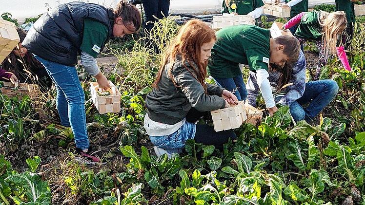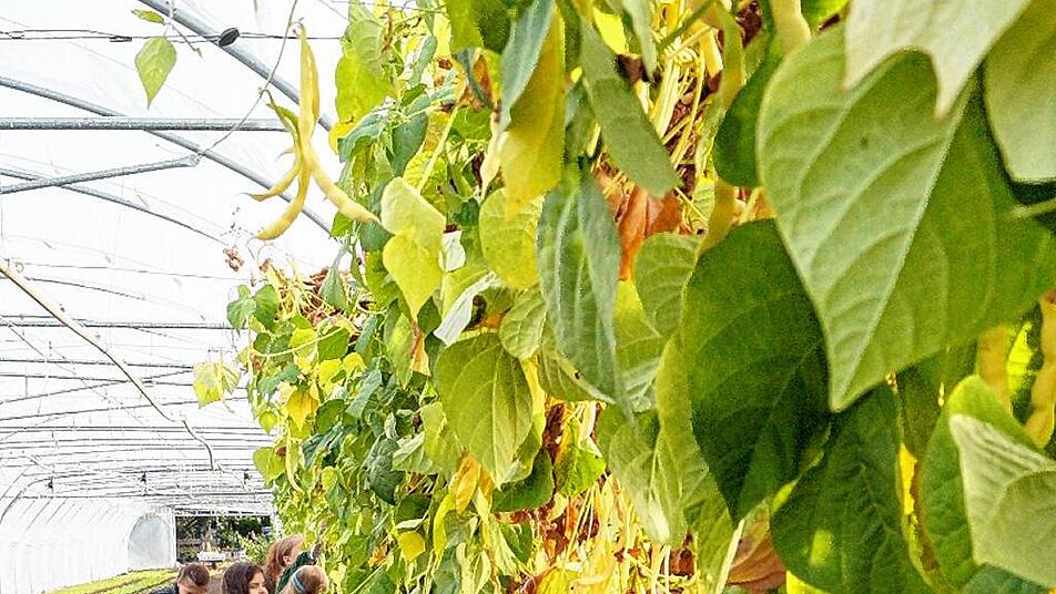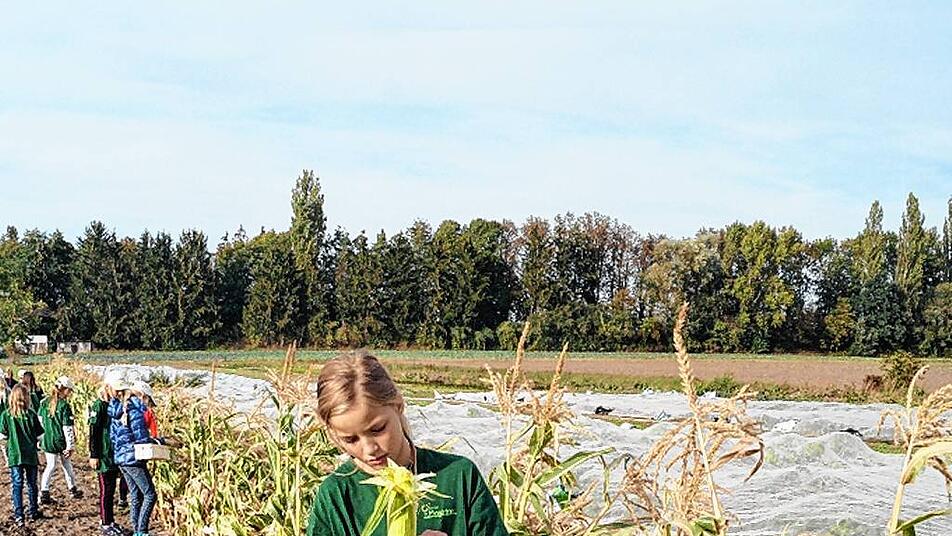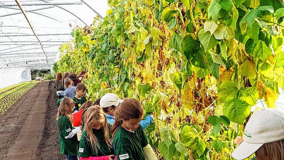 Auf den Feldern und in den Gewächshäusern durften die Kinder Erntekörbchen mit verschiedenem Gemüse füllen. Mangold kam als unterste Schicht hinein, überraschenderweise ist der mit der roten Rübe verwandt. Zuckermais zu ernten war etwas schwieriger, denn da sieht man von außen nicht, ob der Kolben schön und vor allem richtig reif ist. Erst mal frei gelegt werden musste dann die Petersilie, bevor die Kinder sie ernten konnten. Sie ist nämlich, wie viele andere Pflanzen, mit einem engmaschigen Vlies geschützt. Die Kohlfliege kommt da nicht durch und kann so nicht an den Pflanzen knabbern und auch ein anderer Schädling nicht, der dem Gärtner heuer besonders viel Sorgen bereitet. „Unser Hauptschädling hat vier Beine und lange Ohren“, verriet Veit Plietz: Hasen schmecken seine Produkte besonders gut.