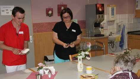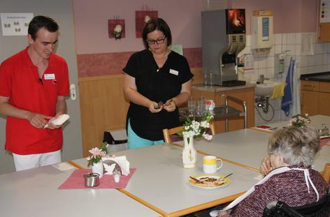 Stefanie Dietsch ist nicht nur die direkte Ansprechpartnerin für Reinhold Broscheit, sondern auch für die anderen Kollegen. Sie vermittelt und sie erklärt. Mit ihrem „Patenkind“ hat sie einen Arbeitsplan erarbeitet, den die beiden immer wieder durchgehen. Manchmal muss sie ihn auch bei der Arbeit antreiben. „Aber viel öfter muss ich ihn bremsen.“ Der 21- Jährige hat seit seiner Geburt Probleme mit der Merkfähigkeit und lernt langsam – aber er will arbeiten und etwas für die Gemeinschaft tun. „Er ist eine große Hilfe“, bestätigt Pflegedienstleiterin Stefanie Gassner. „Für die Kolleginnen und für die Bewohner.“