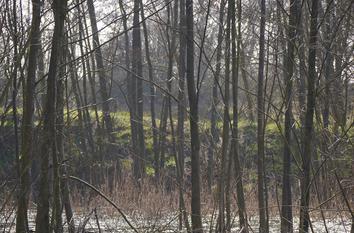 Der weiche Boden gibt unter jedem Schritt nach. Ein Bach fließt glucksend in Bögen und Schleifen vorbei, umspült vermooste Steine, totes Holz. An vielen Ästen sieht man Biber-Bissspuren. Die Frühlingssonne bricht sich tausendfach im gekräuselten Wasser. Es riecht modrig. „Man fühlt sich fast wie in Kanada“, sagt Dieter Lang von der Unteren Naturschutzbehörde. Naja, bis auf den Stacheldrahtzaun im Hintergrund, der den Bimbach von den ehemaligen Harvey Barracks trennt.